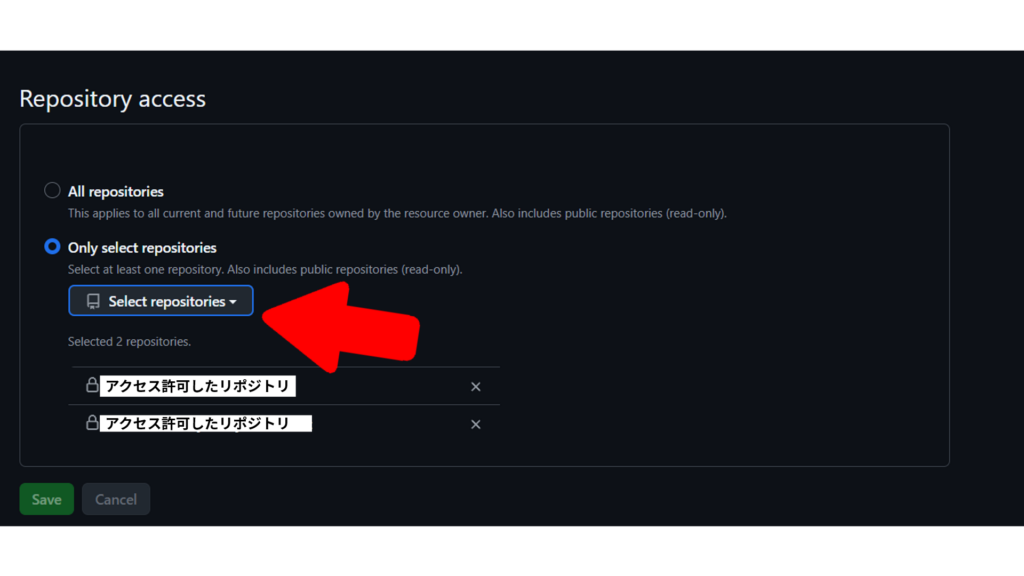 そして、ここで他にアクセス許可したいリポジトリを選択追加し、